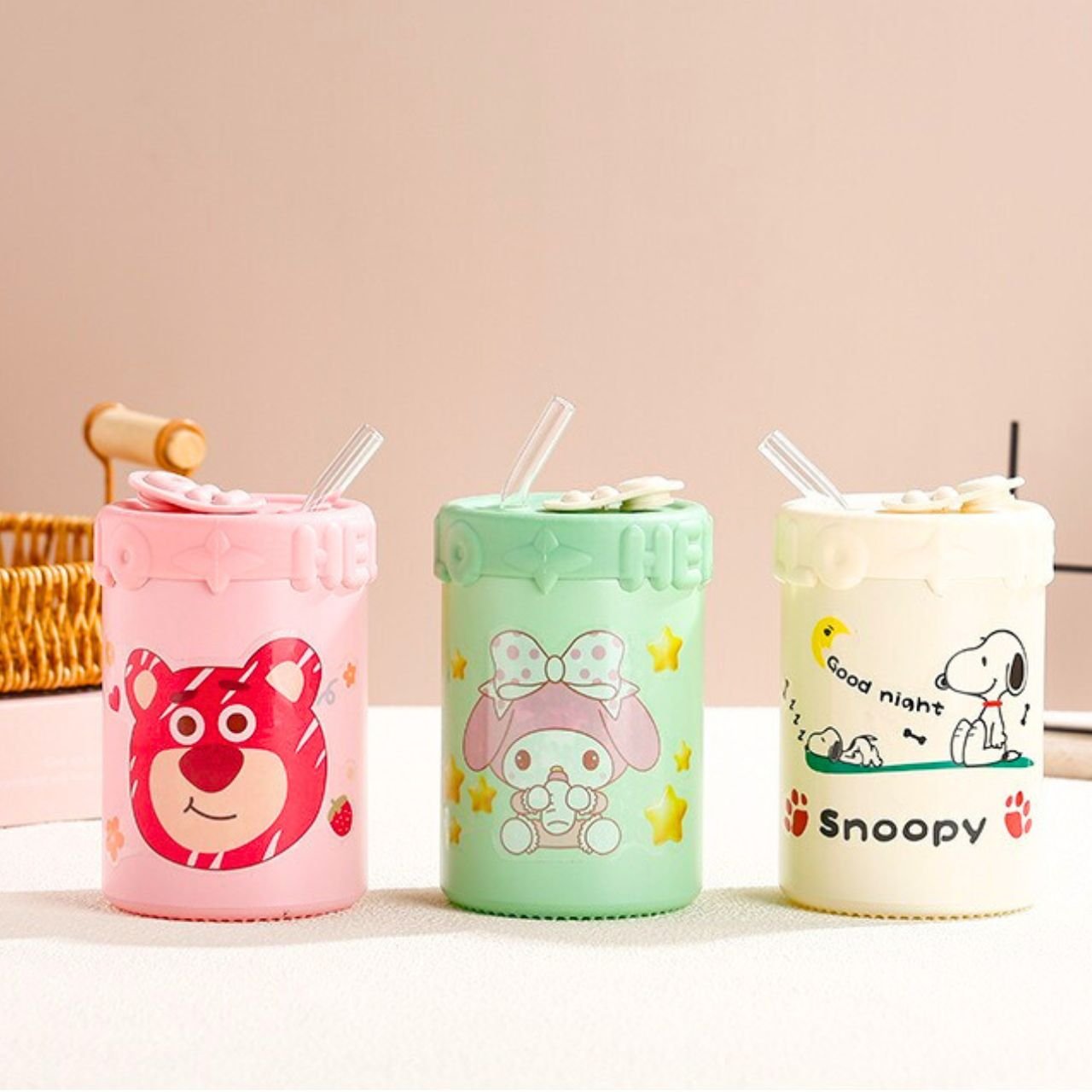 - Charming Cartoon Prints:- Each sipper feature a fun, vibrant colors prints, including beloved characters like a pink teddy bear, my melody, Shin-Chan, and snoopy.
