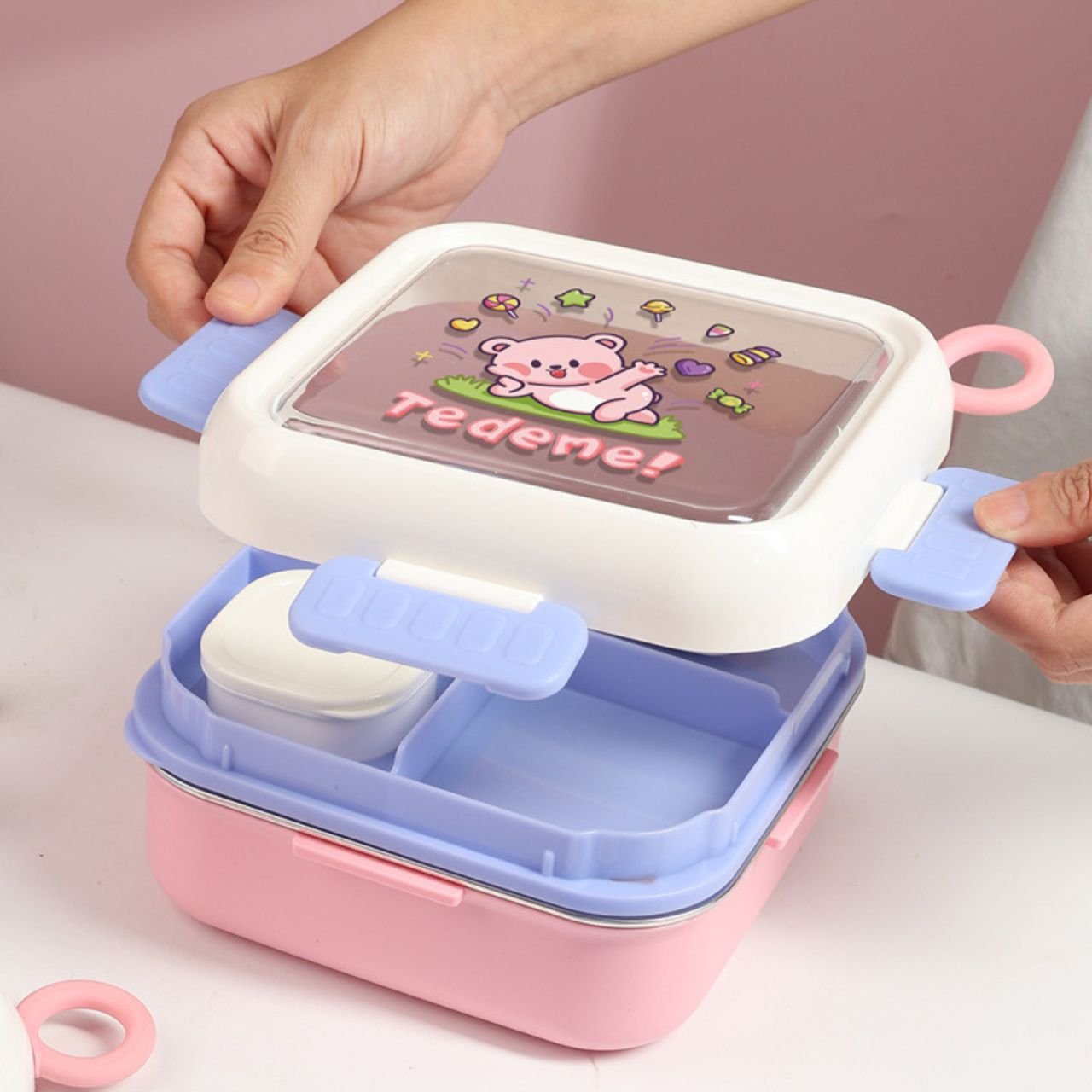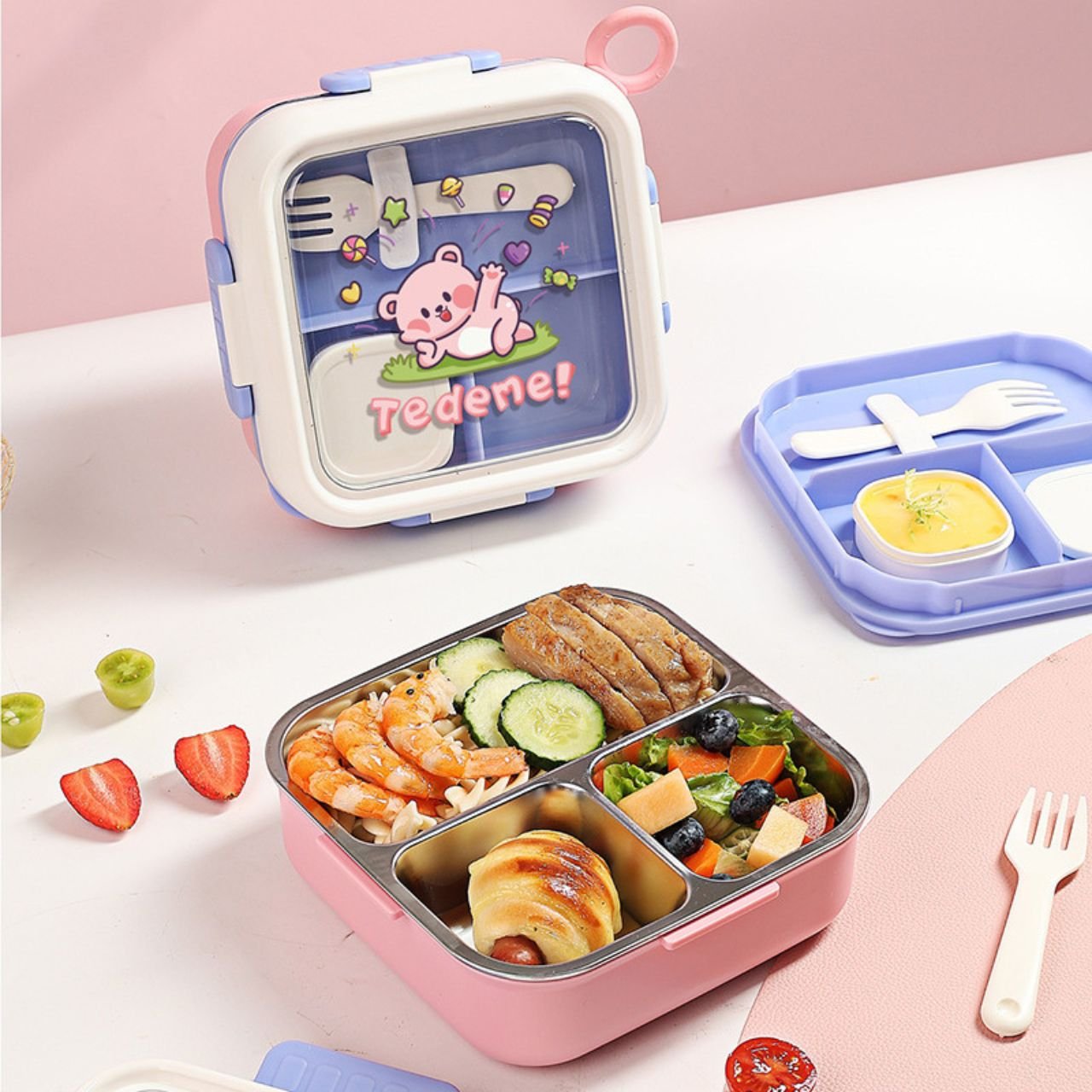 Finally, a stainless steel lunch box that’s as fun as it is functional. With its playful cartoon design and practical feature, this 1000 ml bento box is the perfect way to make mealtime exciting for kids and adults alike. Therefore, say goodbye to boring lunch containers and hello to a fun and reliable companion for your daily routine.