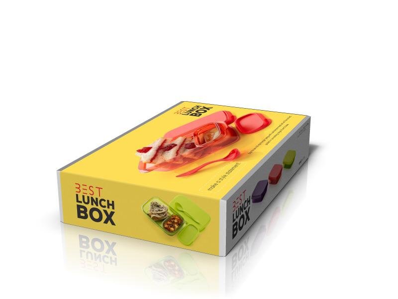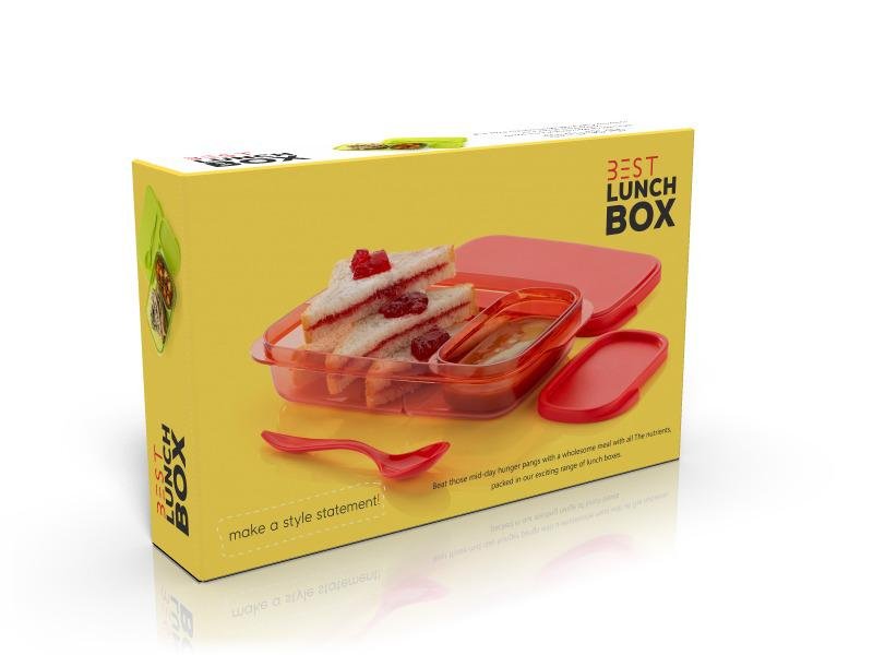 Plastic slim lunch box. Made up of high quality food grade BPA free plastic material. This lunch box comes with small plastic container, lid and spoon. Ideal for office use kids, boys, girls too. Having a capacity of 590 Ml. Red color, food container.
